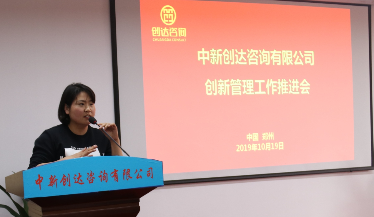 10月19日下午,創(chuàng)達(dá)咨詢在總部八樓會議室召開創(chuàng)新管理工作推進(jìn)會,集思廣益,群策群力,創(chuàng)新工作,明確方向,助力企業(yè)創(chuàng)新發(fā)展。公司董事長楊明宇、執(zhí)行董事徐希萍、黨支部書記董高峰出席會議,各中心負(fù)責(zé)人、全體機(jī)關(guān)人員及在鄭項目部部分人員參加本次會議。